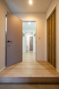 3LDKのコンパクトな間取りながら、廊下をつくらずリビングを中心に家全体がつながる設計に。玄関を入るとファミリークローゼット、手洗いスペース、脱衣室、キッチン、リビングへとそのまま回遊できる動線で、毎日の家事や子育てがぐっとスムーズになります。