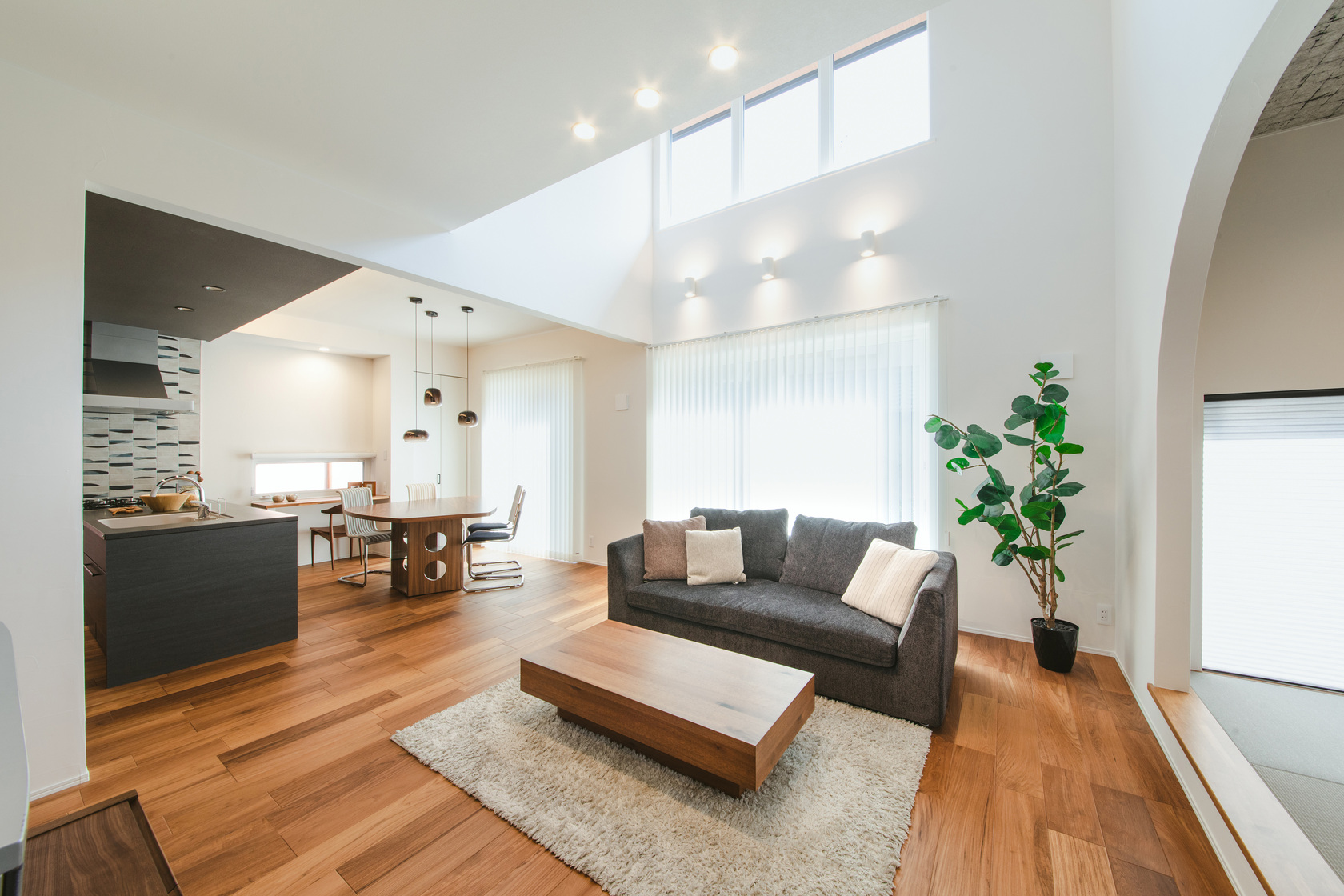 光の明暗と色味で、リビングの印象を自在に変化させることができます。